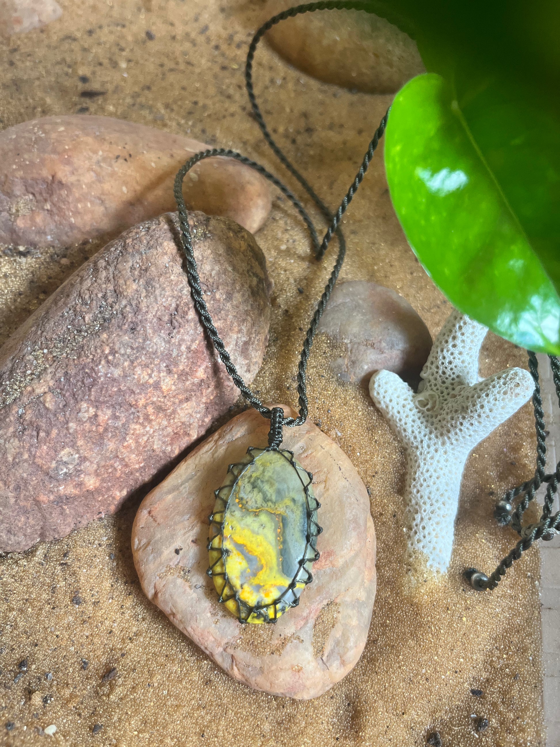 Bumbel B Jasper Green/Yellow/Earthy Pendant - With adjustable macrame cord